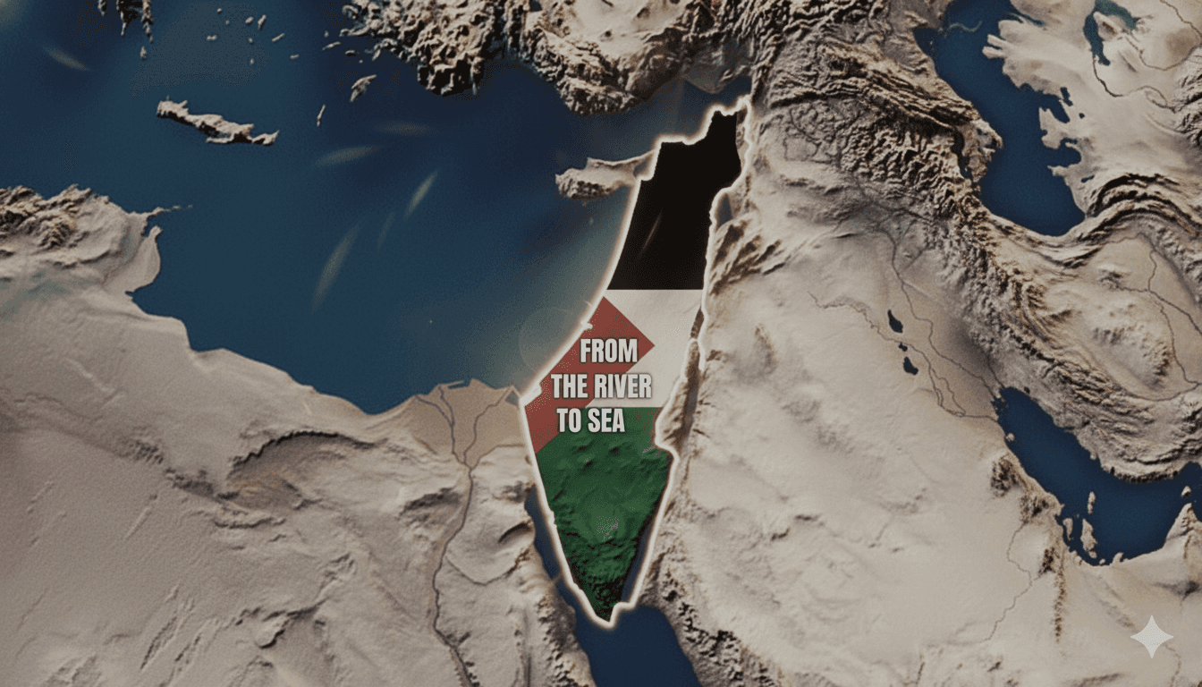 The phrase “from the river to the sea” refers to the territory between the Jordan River in the east and the Mediterranean Sea in the west. Geographically, this encompasses the internationally recognized State of Israel.
